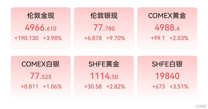 与此同时,大宗商品市场同样表现亮眼,伦敦现货白银涨近10%,黄金逼近5000美元/盎司,比特币收复70000美元关口。