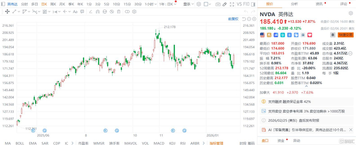个股中,英伟达单日大涨7.87%,接近收复过去3天的跌幅,市值一夜增加3288亿美元(约合人民币22815亿元)。