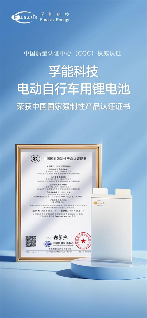 2月17日,孚能科技自主研发的电动自行车用锂电池通过中国质量认证中心严苛测评,获颁中国国家强制性产品认证证书(简称:3C认证)。这是孚能科技继其产品首批通过GB43854-2024国家强制性标准检测认证后,再次成为通过“国强标”认证的锂电池企业。