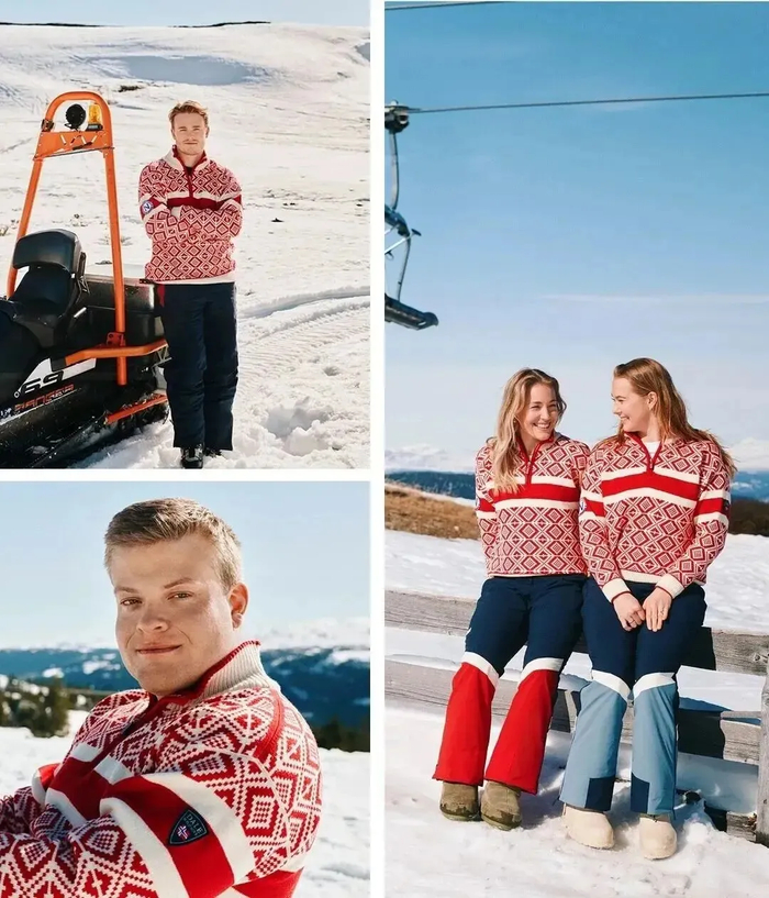 挪威队队服一大亮点就在毛衣上,由挪威品牌 Dale 设计提供。该品牌与挪威国家队的合作关系可以追溯到 1956 年科尔蒂纳丹佩佐冬奥会,当时 Dale 设计了首款奥运毛衣。