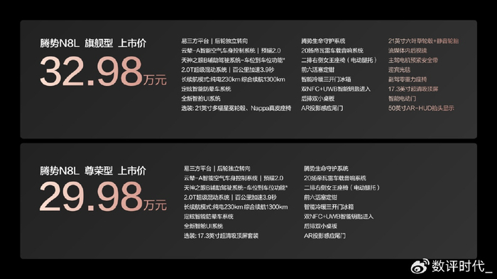 10月28日,“大六座安全豪华SUV”腾势N8L正式上市,其车型精简,只有两款,售价分别为29.98万元,以及32.98万元。