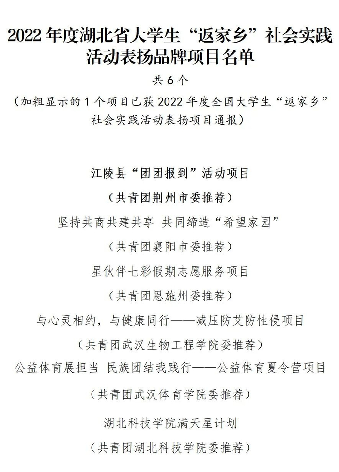 2022年6月,省文明办、团省委、省教育厅、省乡村振兴局、省学联等单位联合下发了《关于开展2022年湖北省大中专学生志愿者暑期文化科技卫生“三下乡”“返家乡”社会实践活动的通知》。按照“团中央统一规划、省级统筹、市级协调、县级实施”及“因需设岗、按岗招人、双向选择、属地管理、就近就便”的工作原则,组织开展了2022年度湖北省大学生“返家乡”社会实践活动。2023年寒假期间,我省继续开展了湖北省大学生寒假“返家乡”社会实践活动。