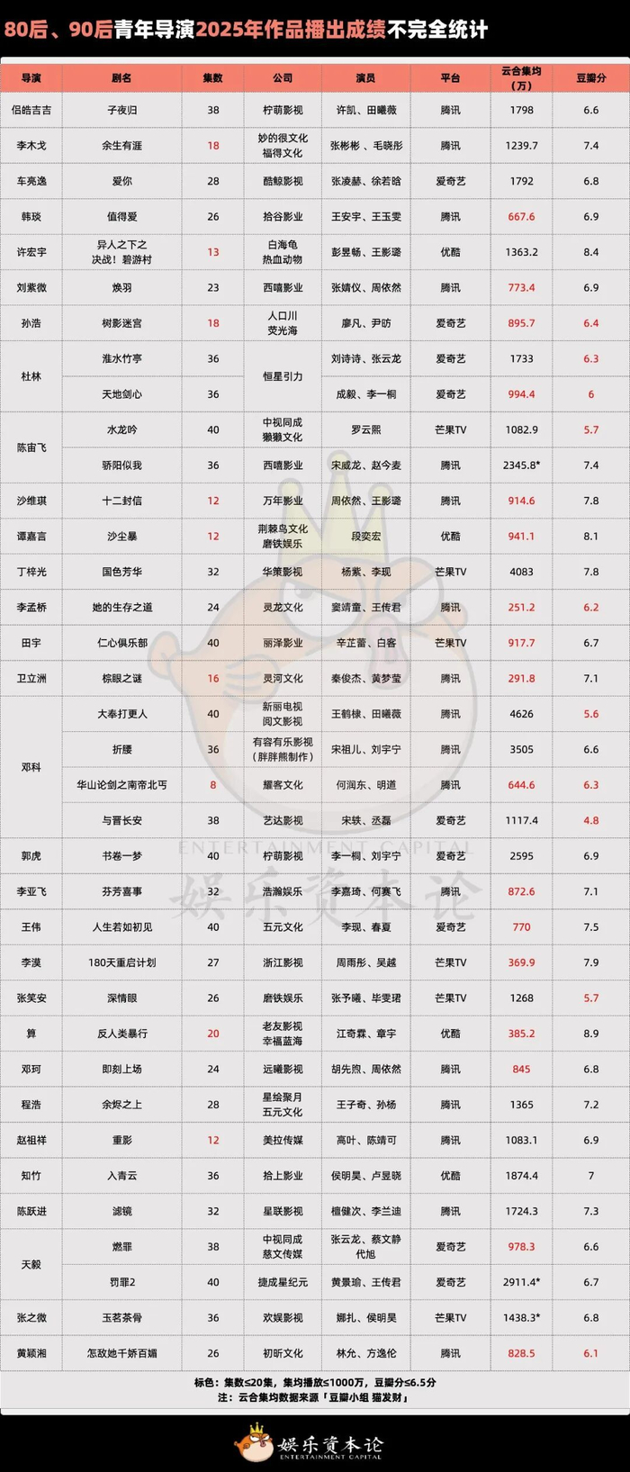 当然,这一批青年导演仍处于成长阶段。根据小娱统计,30名青年导演,去年至今共推出36部作品,其中集均播放量不足1000万的有17部,接近半数;但豆瓣评分在6.5分及以下的仅10部。商业度尚未完全成熟,但叙事完成度与审美表达,已先一步获得认可。