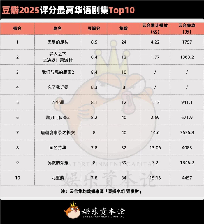 整体来看,2025年的长剧头部公司除了正午阳光接连两部作品失手,大部分中坚力量仍能稳住行业基本盘,新鲜力量不断补位接力,彼此之间形成良性竞争。也正是在这种持续接力中,长剧行业才有可能为观众不断产出真正经得起时间检验的好故事。