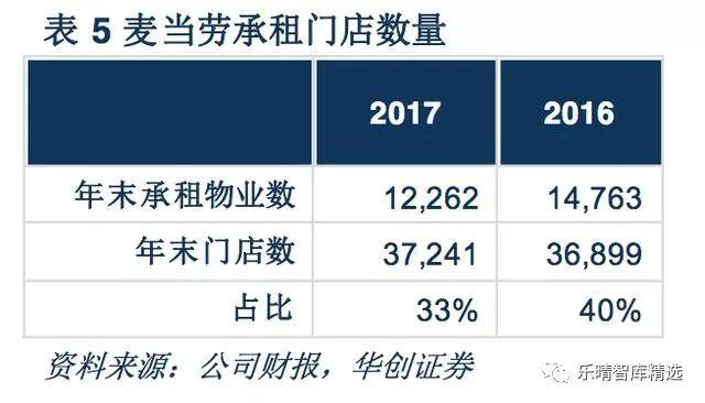 根据麦当劳的披露,2016-2017年,麦当劳承租的门店数分别为14763家、12262家,占总门店比重分别达到40%、33%。