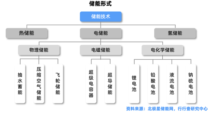 根据能量存储形式,储能技术可分为电化学储能(锂离子电池、钠离子电池、液流电池、铅酸电池)、机械储能(抽水蓄能、压缩空气储能、飞轮储能)、电磁储能和热储能等。