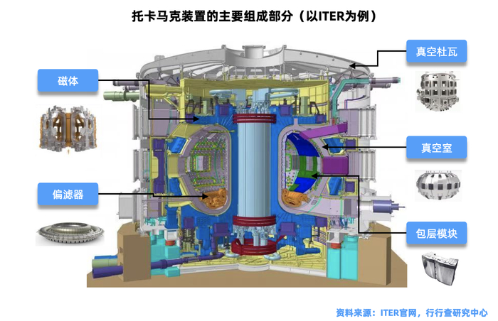 产业链中游是高价值和高壁垒环节。以国际热核聚变实验堆(ITER)为例,其关键系统设备架构包含超导磁体、真空室、第一壁、偏滤器、真空杜瓦、低温制冷和电源系统等。