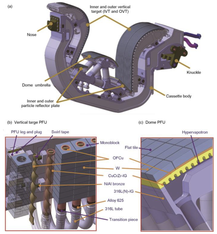 ITER全钨偏滤器示意图,垂直靶板处面向等离子体单元,及穹顶处面向等离子体单元: