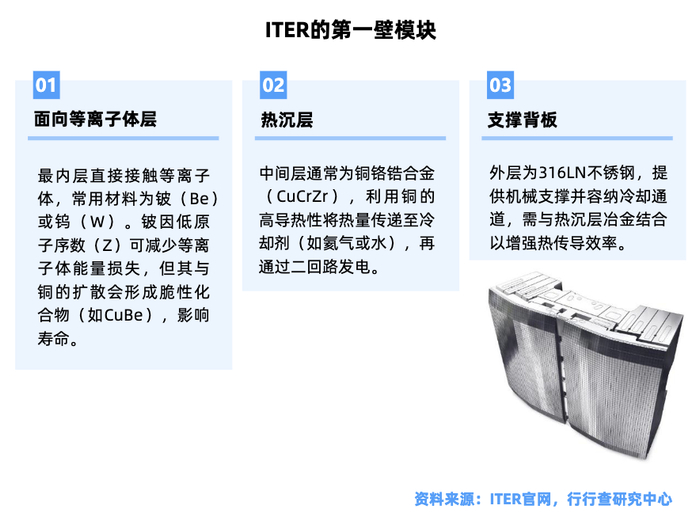 我国为ITER研制的第一壁为三层结构,分别是最内侧的面向等离子体材料(铍)、中间的热沉材料(铜铬锆合金,利用铜良好的导热性把内部的热量传导出来,再通过冷却剂,如氦气,输送到反应堆外用于发电)和背后的结构支撑材料(不锈钢)。