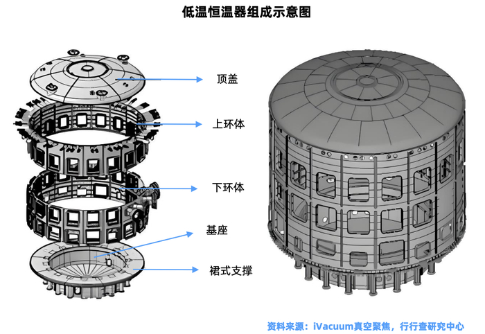 低温恒温器是一种多层真空绝热容器,用于容纳超导磁体系统,并通过维持液氦温区(如-269°C,即4.2K)的超低温环境,使超导线圈处于零电阻状态,从而高效产生强磁场以约束等离子体。