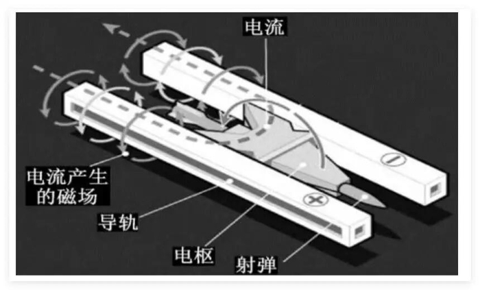 电磁轨道炮原理示意图:
