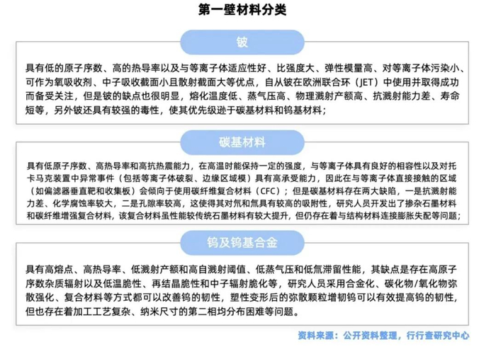 核心材料主要分为第一壁材料、磁体材料高温超导及低温超导材料,偏滤器包层材料、以及其他材料金属钨、铜、燃料氘氚以及电缆等。