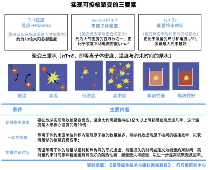 实现核聚变反应,需要同时满足三个条件:即足够高的温度、一定的密度和一定的能量约束时间。三者的乘积称为聚变三乘积。