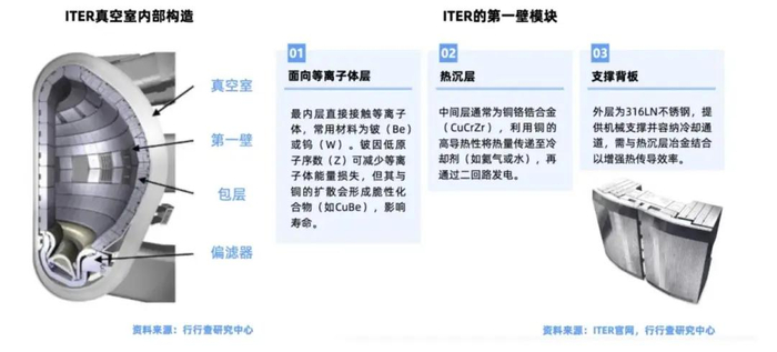 由于直接面对高温等离子体,对材料的耐高温、抗辐射等性能要求极高,目前主要原料为铍、钨和CFC碳纤维。