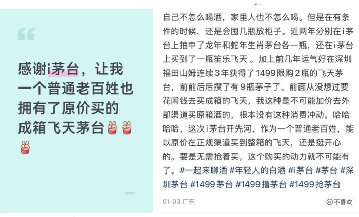 在小红书上晒单的消费者们,正是赶上了1月1日“普茅”登陆i茅台的“首班车”。这个动作,曾被外界解读为一次针对黄牛和传统渠道的“战术奇袭”。