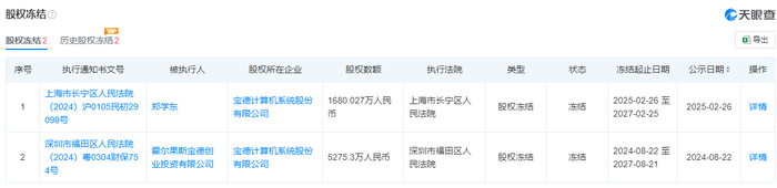 此外,天眼查显示宝德计算机的两个股东郑学东和霍尔果斯宝德分别被冻结股权数额为1680万元和5275.3万元,这点在公告中并未披露。