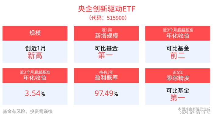跟踪精度方面,截至2025年7月2日,央企创新驱动ETF近5年跟踪误差为0.038%,在可比基金中跟踪精度最高。