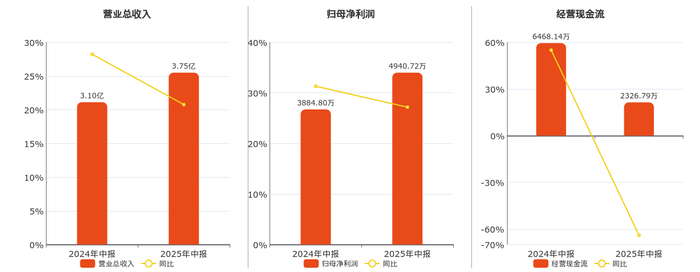 公司营业总收入为3.75亿元,较去年同报告期营业总收入增加6445.18万元,实现3年连续上涨,同比较去年同期上涨20.77%。归母净利润为4940.72万元,较去年同报告期归母净利润增加1055.92万元,实现3年连续上涨,同比较去年同期上涨27.18%。经营活动现金净流入为2326.79万元。