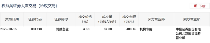 10月16日,博纳影业大宗交易成交82万股,成交额400.16万元,占当日总成交额的1.61%,成交价4.88元,较市场收盘价5.52元折价11.59%。
