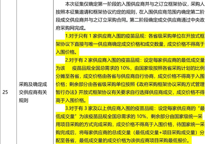 按本次文件程序,这两家公司成为第一阶段的入围供应商,此后还要确定第二阶段的成交供应商并订立采购合同。文件规则显示,每家供应商的最低成交量为全国总需求的10%,由国家级按照各省采购计划的比例分摊至各省,成交价格由各省与供应商自行协商,剩余部分由各省级采购单位自行选择供应商成交,两部分的成交价格均不得高于入围价格。