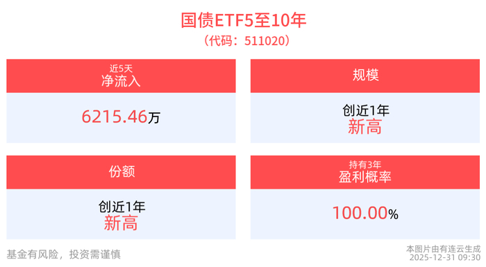 流动性方面,国债ETF5至10年盘中换手0%,成交0.00元。拉长时间看,截至12月30日,国债ETF5至10年近1月日均成交7.37亿元。