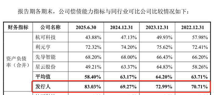 恒翼能对资金的需求体现在长期借款的持续增长上,该项数据从2022年的4972.83万元增至2025年上半年的2.05亿元。整体上,公司合并资产负债率也从2022年的70.71%一路攀升至2025年上半年的83.03%,显著高于同行业可比公司平均水平。