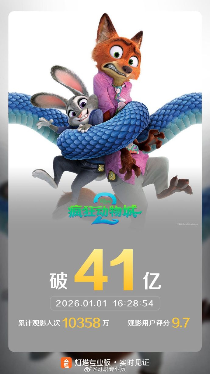 据灯塔专业版实时数据,截至1月1日16时28分,影片《疯狂动物城2》票房突破41亿。