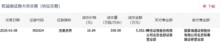 1月8日,完美世界大宗交易成交300万股,成交额5052万元,占当日总成交额的6.34%,成交价16.84元,较市场收盘价17.01元折价1%。