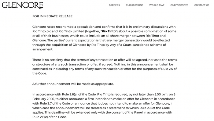当地时间1月8日,嘉能可发布声明,确认其正与力拓集团和力拓有限公司(统称力拓)就双方部分或全部业务的潜在合并初步磋商,其中可能包括力拓与嘉能可之间的全股票合并。各方目前预期,任何合并交易将通过力拓以法院批准的安排计划方式收购嘉能可来实现。