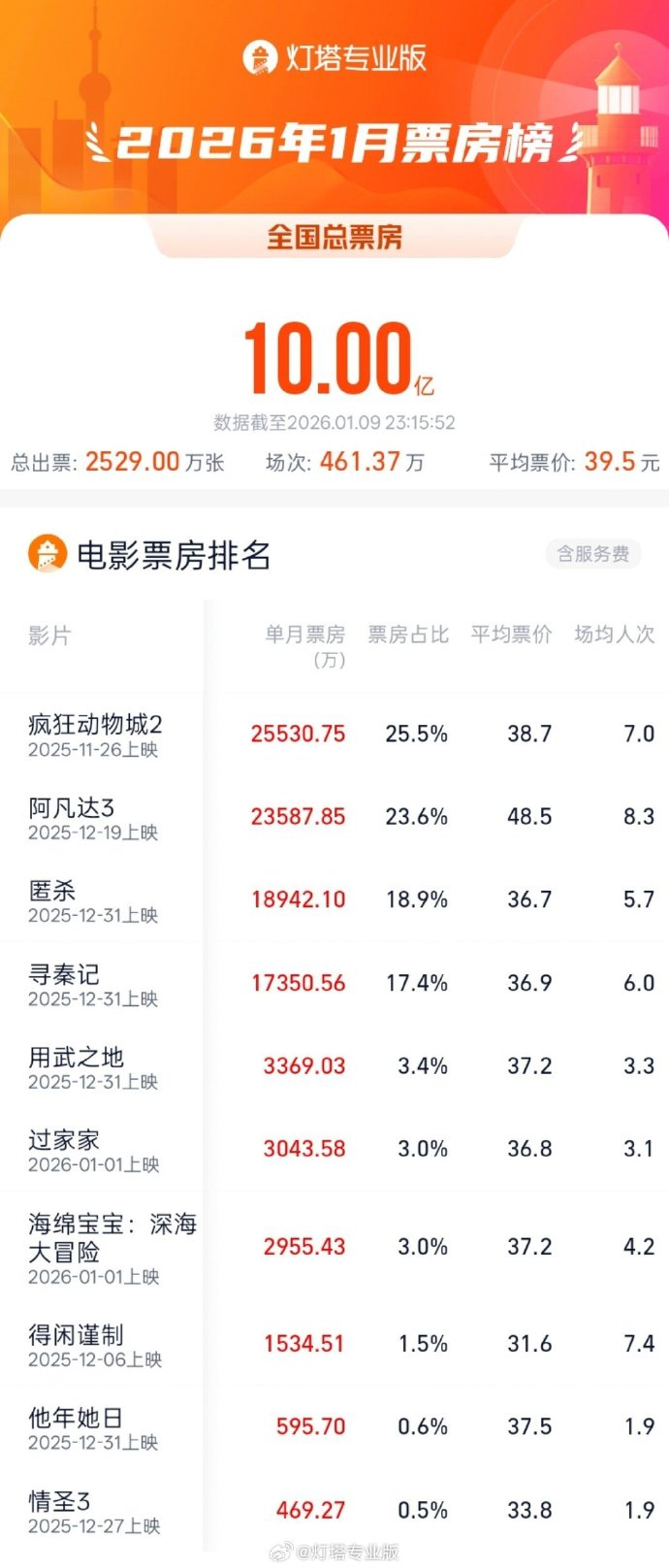 据灯塔专业版,截至1月9日,2026年1月总票房(含预售)已突破10亿。