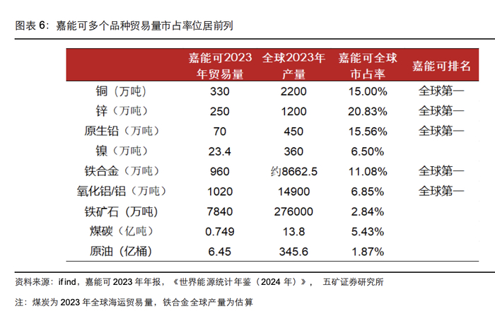 五矿证券数据显示,嘉能可氧化铝/铝贸易量居全球第一,2023年贸易量达1020万吨,全球市占率为6.85%。铁矿石当年贸易量为7840万吨,全球市占率2.84%。