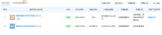 天眼查显示,雅石共赏仅投资两家企业——铜陵清逸时刻科技有限公司(持股40%)、铜陵宜朵生物科技有限公司(持股25%)。