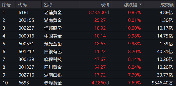 截至2026年1月26日 09:53,中证沪深港黄金产业股票指数(931238)强势上涨5.53%,成分股湖南黄金、恒邦股份、中国黄金、豫光金铅涨停,老铺黄金涨超10%,白银有色、晓程科技等个股跟涨。