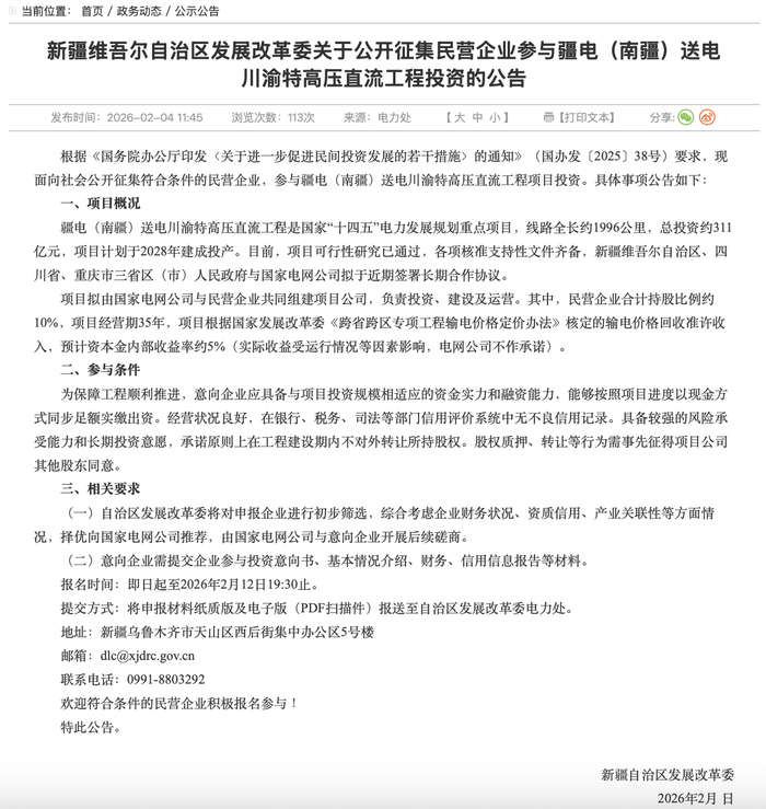 2月4日,新疆维吾尔自治区发展改革委(下称新疆发改委)发布关于征集民营企业参与疆电(南疆)送电川渝特高压直流工程投资的公告。