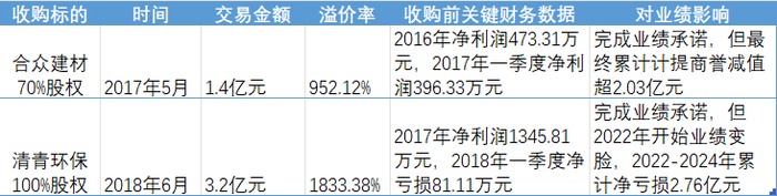 2018年,韩建河山作价3.2亿元清青环保,切入热门赛道环保行业。标的2017年业绩亮眼,但2018年Q1突然大幅下滑至净利亏损,最终虽然踩线完成了三年累计1.2亿元净利润的承诺,但标的后续业绩变脸持续亏损,2025年底被0元转让。