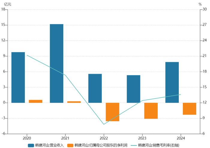 韩建河山的主业近年来持续承压。受水利建设景气周期下行、重点工程启动延后及原材料价格上涨等多重因素影响,公司营收规模从2021年的15.18亿元一路缩水至2024年的7.87亿元,三年间近乎腰斩;归母净利润更是连续三年亏损,2022年至2024年累计净亏损8.95亿元。