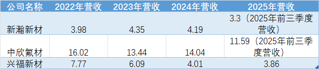 界面新闻选取兴福新材核心产品氟酮(DFBP)同行业公司新瀚新材 (301076.SZ)、中欣氟材 (002915.SZ) 进行对比发现,两家公司虽业绩承压,中欣氟材2023-2024年净利为亏损状态,但均未发生营收规模断崖式下滑的现象。
