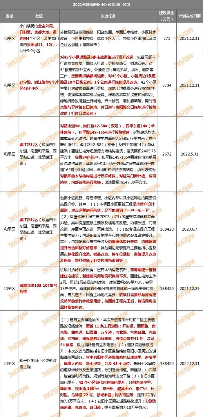 ☝2021年城镇老旧小区改造项目名单(涉及和平区部分)