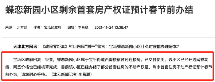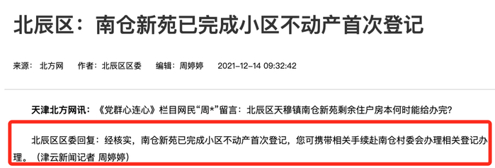 北辰南仓新苑已完成小区不动产首次登记