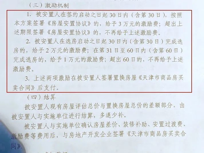 3.上述两项激励在被安置人签署置换房屋《天津市商品房买卖合同》后支付。