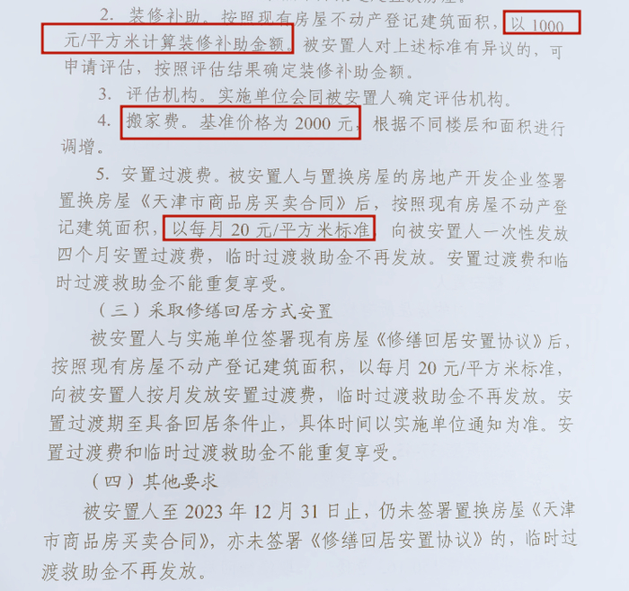 5、安置过渡费。被安置人与置换房屋的房地产开发企业签署置换房屋《天津市商品房买卖合同》后,按照现有房屋不动产登记建筑面积,以每月 20 元/平方米标准,向被安置人一次性发放四个月安置过渡费,临时过渡救助金不再发放。安置过渡费和临时过渡救助金不能重复享受。