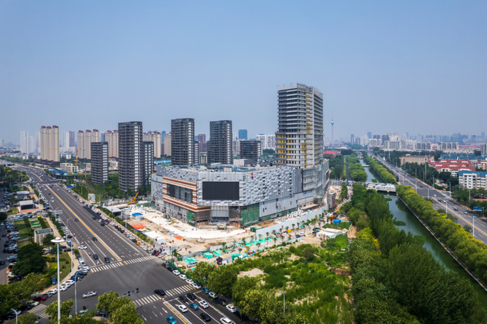 该商业综合体项目坐落于塘沽湾核心位置,是区域内首个集商业、居住、休闲、娱乐、商务等功能于一体的大型综合体项目,分为1#商业酒店及2-8#单体商业街两个区域,预计2024年8月中旬主体封顶完成。