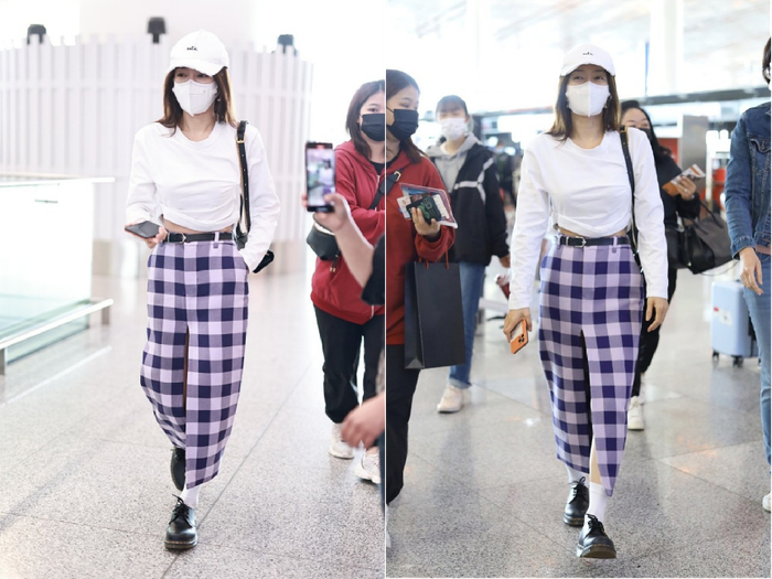 穿搭上显出黄金线条,还能够突出小蛮腰,很性感,下身搭配一条蓝色格纹半身裙,上短下长的穿搭方式显出超显比例,穿着上显高显瘦。
