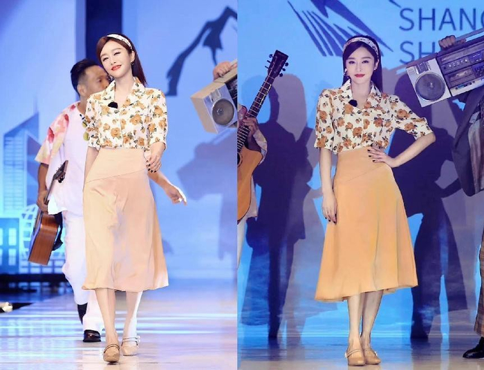 下身搭配黄色半身长裙,与印花衬衫的匹配度很高,同时将上衣的衣摆塞进裙子里,打造出小蛮腰,穿着上丝毫不会显得老气,涂上红唇、加上圆环耳饰与发带,很有复古女郎气息,穿着上也很减龄。