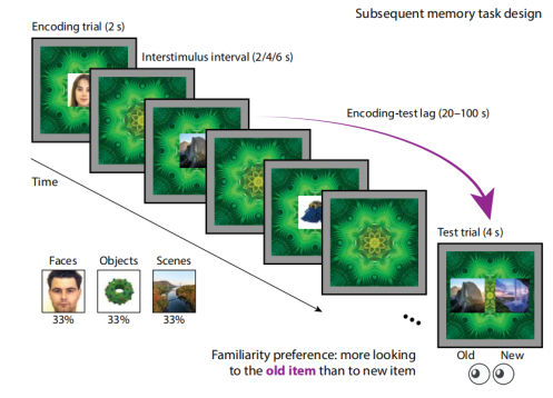 同时,作者改进了适用于成人长期记忆研究的实验方法,使其适用于婴儿。在新的测试过程中,编码测试与测试试验交错进行,婴儿在扫描仪中观看一系列面孔、物体和场景,在这些识别记忆的编码试验过程中穿插一些与新图像相对的旧图像,进行测试试验,观察婴儿对新旧图像的注视行为。