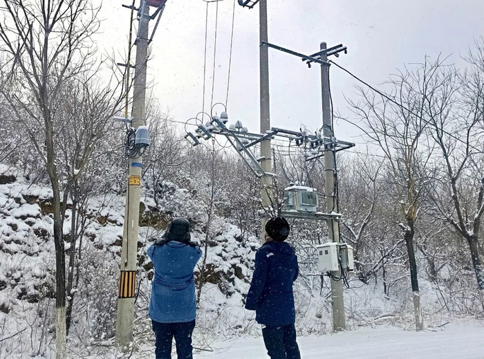 1月17日,国网北京门头沟供电公司运维人员冒雪特巡10千伏配电线路。(吕耀宗/摄)
