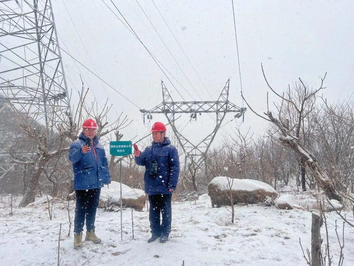 1月17日,国网北京电力检修分公司输电运行专业人员冒雪对110千伏输电线路开展线路观冰和巡检工作。(赵强/摄)