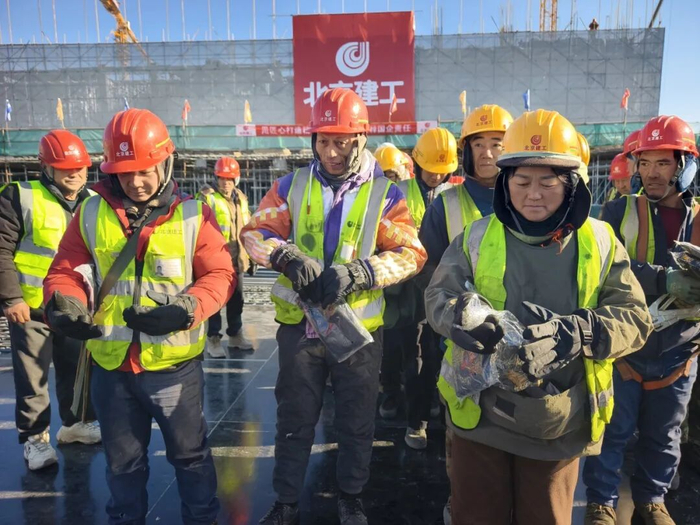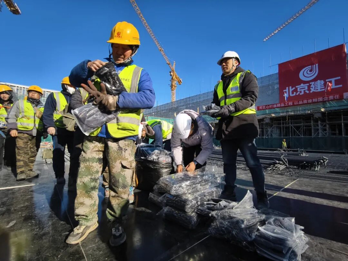 北京建工集团鲜活农产品流通中心二期项目负责人祁岭介绍,该项目共有约10万平方米的冷库,其中-25℃的超低温冷库面积达到7.4万平方米,“整个项目就是一个超级大冰箱,我们赶在‘大寒’这天为工人师傅们送去他们最需要的礼物,感谢他们为项目做出的辛勤付出。”
