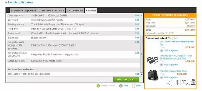 联想在美国采用订单式销售,也就是用户可以在网站上自己选择配置;而在中国用户不可以自己选配置,所有计算机的配置都是联想规定好的。于是我在联想中国网站上选择几款机器,它们的配置都是联想给定的,配置和价格一目了然;同时在联想美国官网参照中国官网的配置和保修服务提交订单,比对两个网站显示的价格差异。这里特别需要说明,因为联想THINKPAD在国内的高端机型都赠送意外保护,而此项服务在美国需要消费者另行购买,因此在美国官网选择相同配置机型的时候,我也加上了意外保护服务的价格。