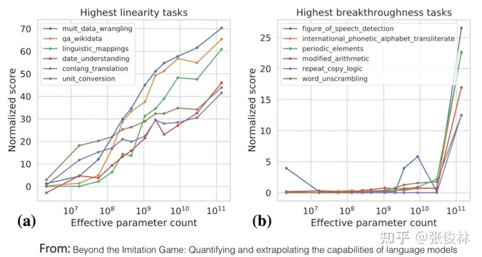 线性增长(左)与打破阈值后的突变(右),来源:知乎而“大规模”就是实现这一质变的关键因素,这通常意味着百亿或千亿级的参数量。